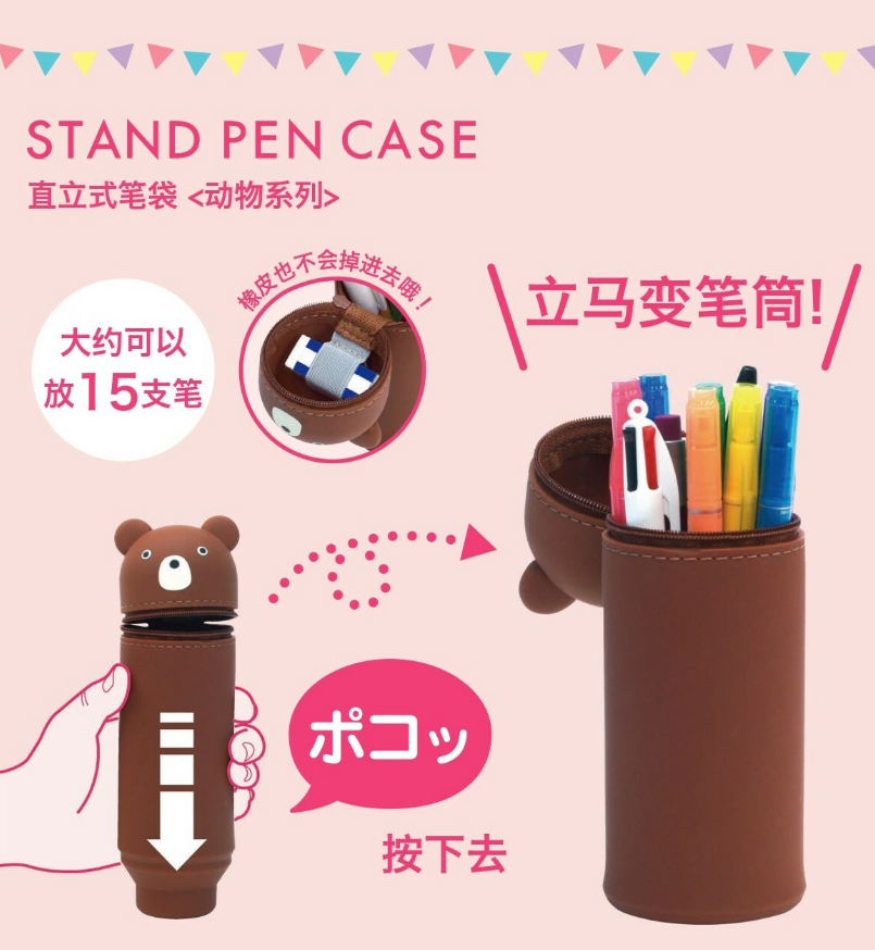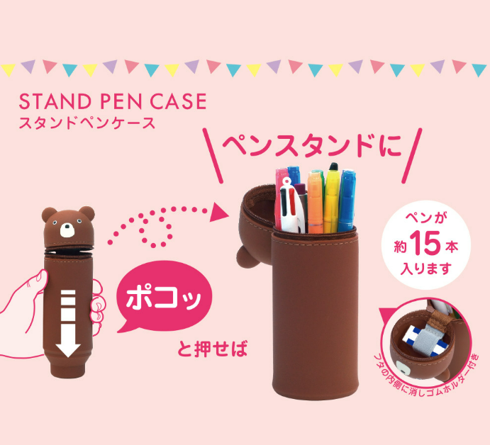 *備受歡迎的[立式]筆盒。*從頂部輕輕一推,它就變成了筆架。*可容納 15 支筆。(可容納的筆數取決於筆的類型)。*收筆時,將筆盒底部拉出。*蓋子上有一個橡皮夾。